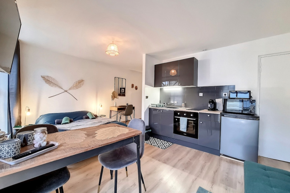 The sleeping area guarantees you a good night's rest with a 140×190 cm double bed. Need an extra bed? The sofa bed can accommodate one person, but it is not a real bed. It can be used for a child, but you will need to bring your own linens (towels, duvet, pillow, and bed linen). In terms of amenities, everything is ready: a functional kitchen (toaster, Tassimo coffee maker, kettle, etc.), a space for remote working with an extra console, and everything you need for a hassle-free stay. The bathroom has a shower. You'll also appreciate the smart TV and WiFi connection!