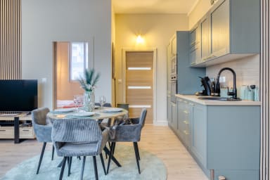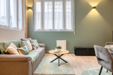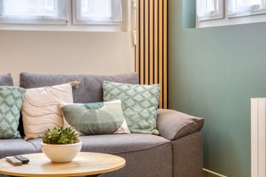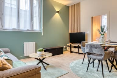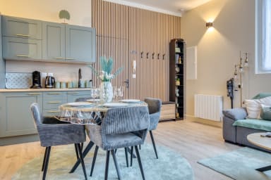 En poussant la porte, vous découvrez un séjour chaleureux où l’on a envie de ralentir et de poser ses valises. Un coin repas vous attend pour partager un petit-déjeuner ou un dîner à quatre, tandis qu’un canapé confortable, convertible en couchage d’appoint (linge de maison et de lit disponible pour le deuxième couchage sur simple demande à notre conciergerie en supplément à 12€), fait face à la télévision pour vos soirées détente. La lumière glisse le long des murs pastel et donne au lieu une ambiance douce, propice au repos après une journée de travail ou de visites.