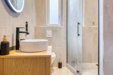 La chambre indépendante, aux tons terracotta, vous offre un lit 160x200 cm dans lequel vous n’aurez plus envie de quitter les draps. Une penderie vous permet de ranger vos affaires et de vous installer confortablement, que vous soyez en déplacement professionnel ou en escapade romantique. La salle de douche, moderne et fonctionnelle, comprend les WC ainsi qu’une machine à laver le linge, très pratique pour les séjours prolongés. Du matériel de repassage est également à votre disposition. Le linge de lit et de maison est fourni pour que vous puissiez voyager léger.