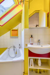 La chambre dispose d’un lit double confortable et de rangements. La salle d’eau, au charme atypique, comprend une douche et des WC.
