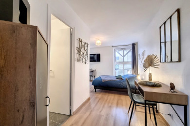 La partie nuit vous garantit de vraies nuits reposantes avec un lit double 140×190 cm. Côté équipements, tout est prêt : cuisine fonctionnelle ( grille-pain, cafetière tassimo, bouiloire,etc) , espace pour télétravailler avec console d'appoint, et tout le nécessaire pour un séjour sans contraintes. La salle d’eau dispose d’une douche. Vous apprécierez également la smart TV et la connexion WIFI !